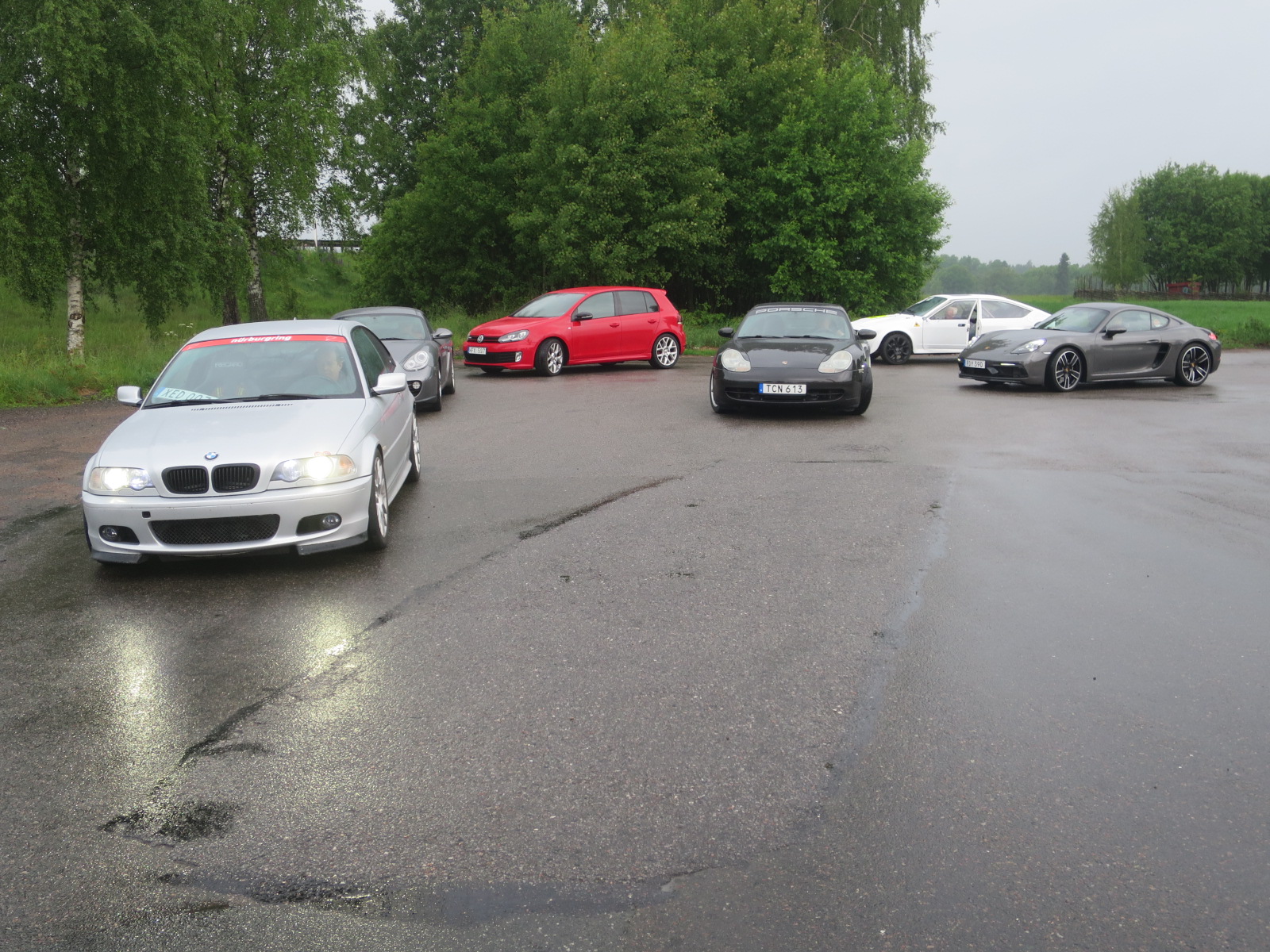 Runt kl 13 kom regnet. Intressant att känna på skillnaden mot torr asfalt. Några av oss körde på vanliga sommardäck, vilka kändes lite hala på torrt underlag men kom mer till sin rätta på vått underlag.