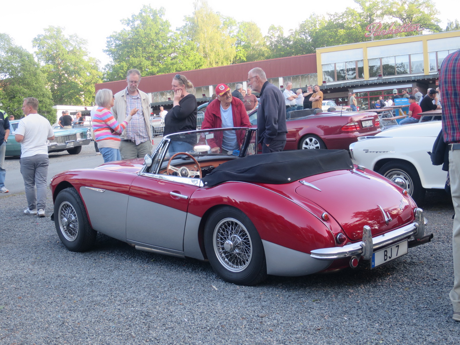 Första bilträffen efter semesteruppehållet och en behaglig sommarkväll hade lockat 400-500 bilar och ca 3000 personer som njöt av tillställningen – varav ett flertalSSJ-medlemmar. På tre av bilderna ses några av deras fordon. Den första bilden visar tre vanligt förekommande klassiker från förr i tiden med vissa utmärkande konstruktionsdetaljer: framhjuldrift, strömlinjeformad kaross respektivekortslagig motor – vilket gjorde den populär på tävlingsbanorna pga av sin varvvillighet.